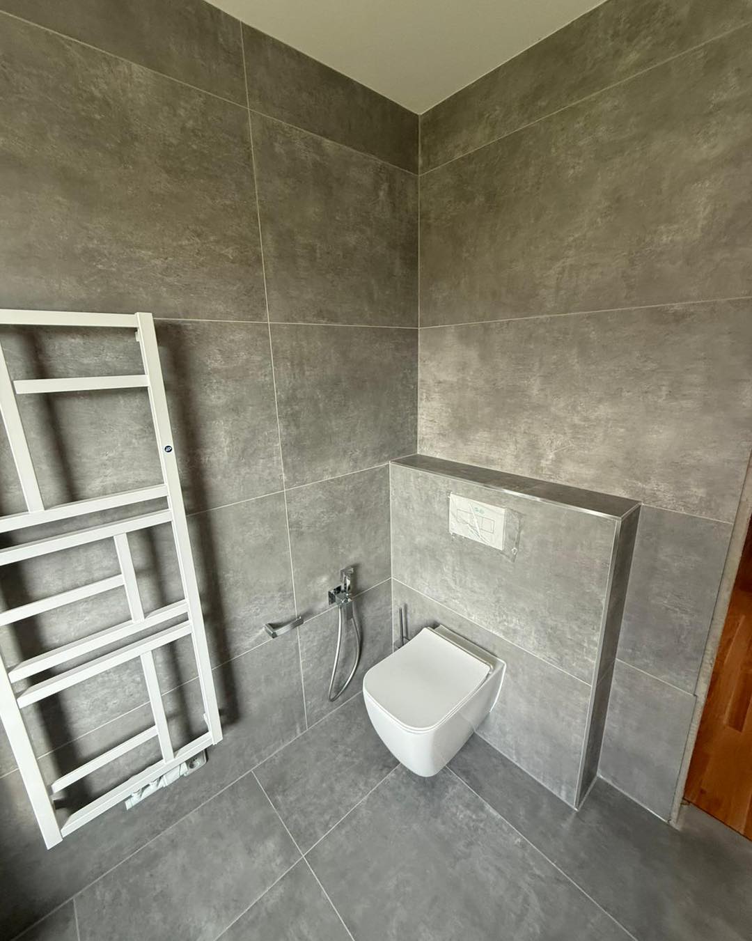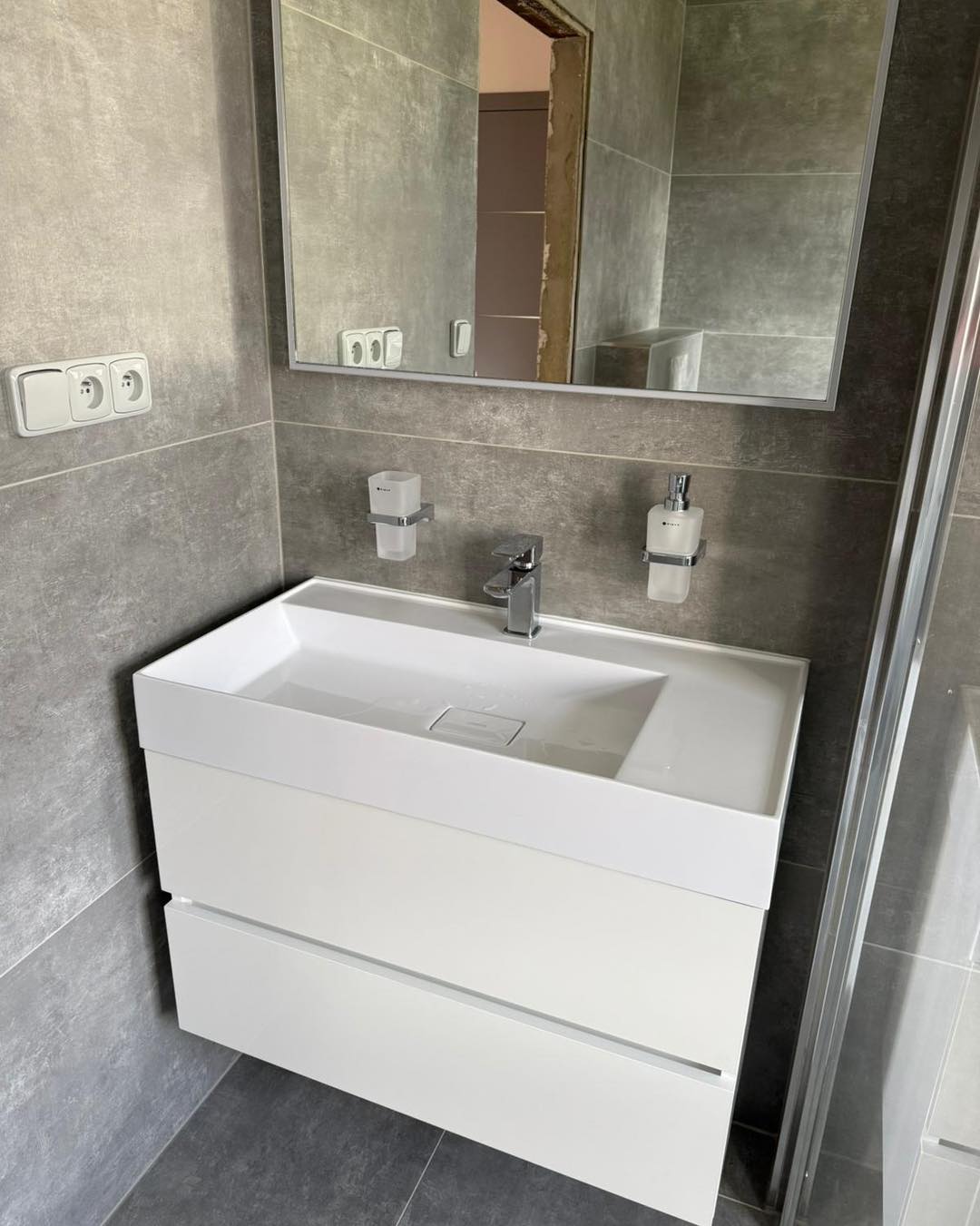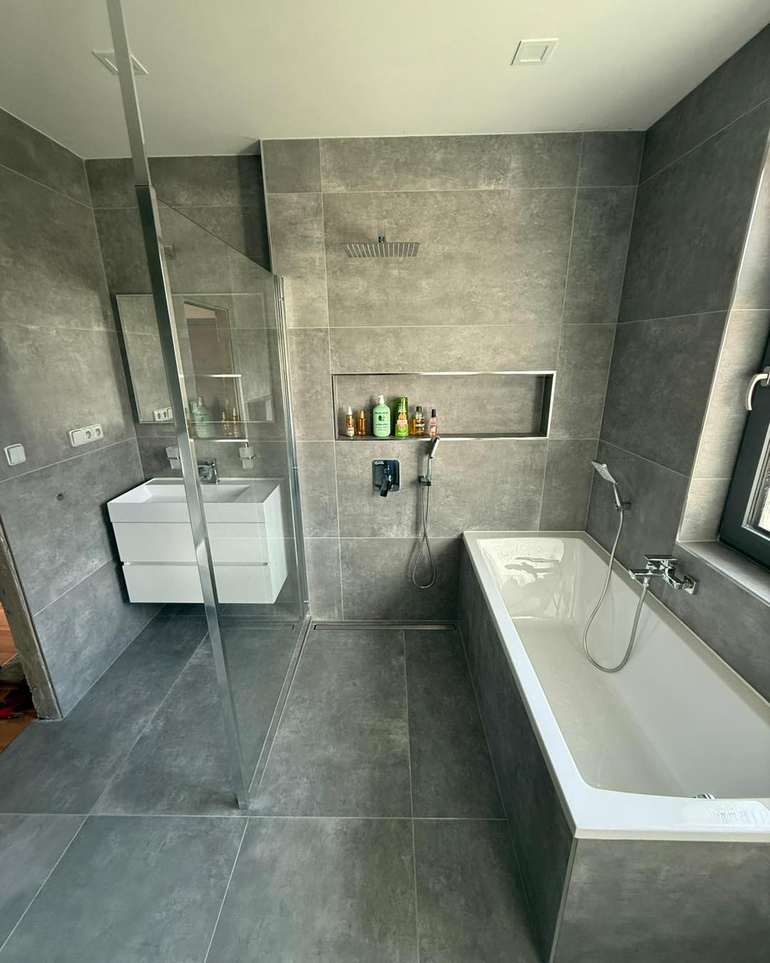 - Velkoformátová dlažba na stěnách i podlaze pro čistý, moderní vzhled