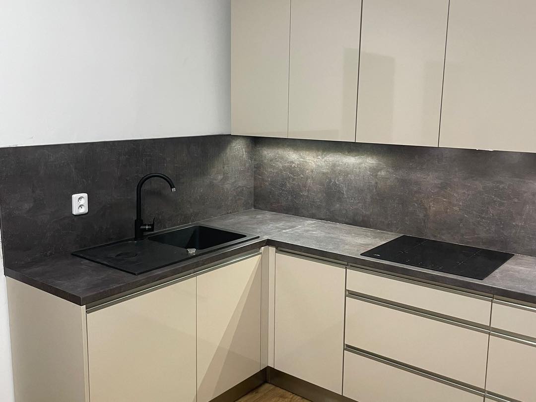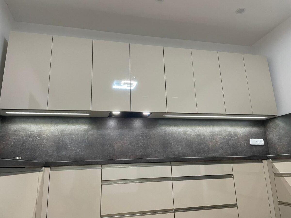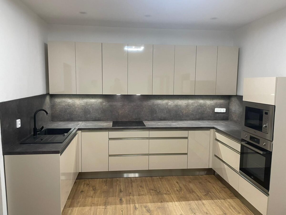 Máme pro vás novou realizaci kuchyně. Kuchyň v kontrastních barvách šedé a s jasmínovým leskem působí moderně a elegantně. Granitový dřez s odkapem a černé spotřebiče korespondují se zapuštěnými nerezovými úchytkami.